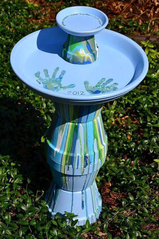 The Bird Bath made out of planters. This is such a cute and definitely an affordable way to add a bird bath to your yard. Birds are attracted to a variety of colors, including red, orange, yellow, blue, and green. Place your bird bath close to the bird feeders and enjoy. Have fun with the art by painting and adding your own decorations.